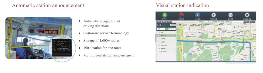 Vehicle information will be positioned with GPS, sent to the platform and distributed to all electronic station display to show vehicle s and station arrival to passengers. Such information as the upcoming vehicles and the drop-off reminders is available to passengers via App or WeChat Official Account to facilitate their daily commuting.